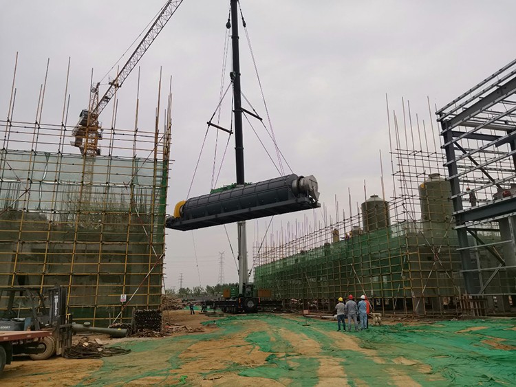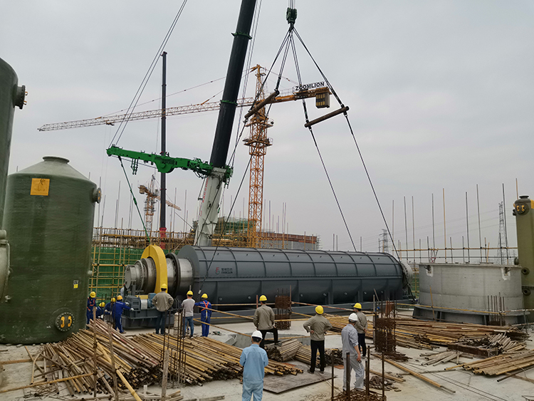 23日上午7点,随着吊装指挥的一声令下,焙烧炉开始起吊。在现场所有建设者的注视下,500吨汽车吊平稳提升,至8点37分,焙烧炉顺利吊至裂化剂厂房6米层楼板上。