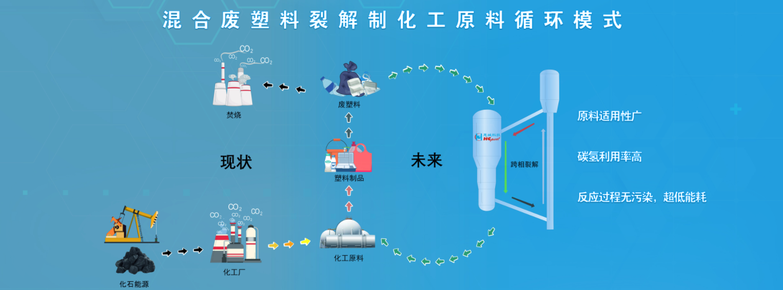 惠城环保自主研发的混合废塑料深度催化裂解(CPDCC)技术,成功开创了碳氢资源循环使用的新途径,这将是中国经过验证认可的最具影响力的废塑料化学回收工艺,大幅拓宽了废塑料处理方式并将其转化成具有高附加值的化工原料,帮助降低中国在废塑料加工过程中的能耗和成本,从而减少了碳排放,促进实现塑料的循环利用。